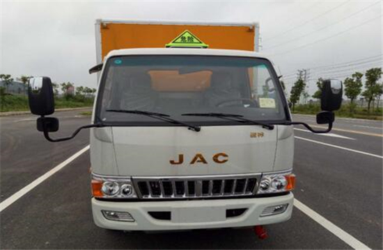 危险货物运输车的车辆类型为:EX/Ⅲ,运输品名:炸药,雷管,类项号: 1.1D,1.1B。车厢顶部封闭,不可开启,选装右侧厢体前部开门,侧防护为螺栓连接,后防护为焊接连接,后部防护装置断面尺寸(宽×高):50mm×100mm,离地高度为410mm.该车装配具有卫星定位功能的汽车行驶记录仪,该车装配有限速装置,ABS控制器型号及生产企业:CM4XL-4S/4M,广州科密汽车电子控制技术股份有限公司,安装前盘式制动器。