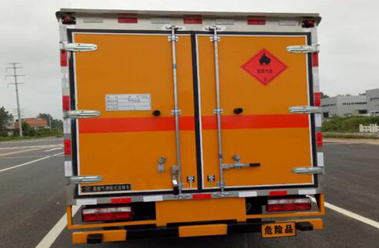 危险货物运输车的车辆类型为:EX/Ⅲ,运输品名:炸药,雷管,类项号: 1.1D,1.1B。车厢顶部封闭,不可开启,选装右侧厢体前部开门,侧防护为螺栓连接,后防护为焊接连接,后部防护装置断面尺寸(宽×高):50mm×100mm,离地高度为410mm.该车装配具有卫星定位功能的汽车行驶记录仪,该车装配有限速装置,ABS控制器型号及生产企业:CM4XL-4S/4M,广州科密汽车电子控制技术股份有限公司,安装前盘式制动器。 |