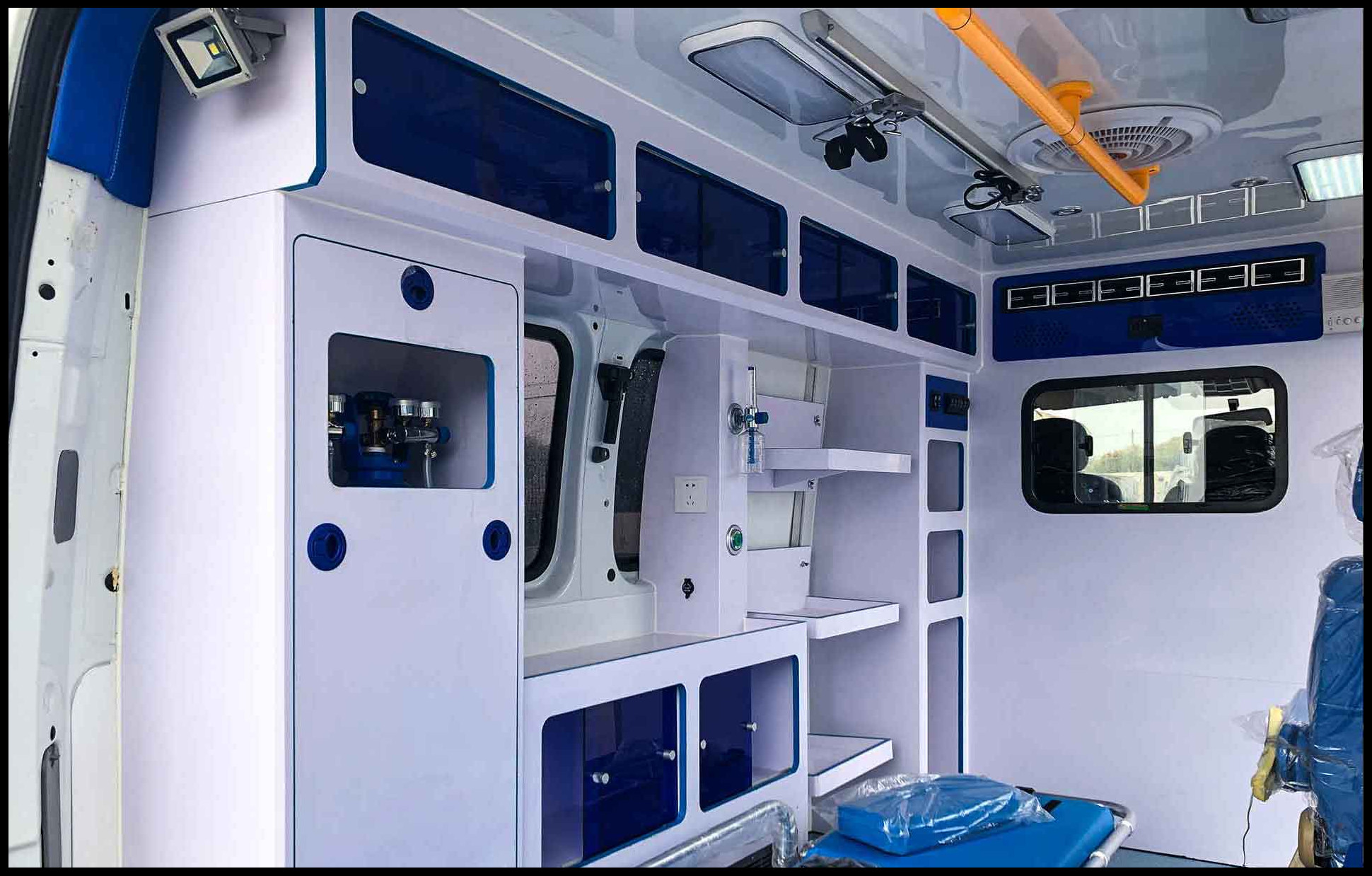 该车配备医疗器械柜,担架,氧气瓶,消毒灯等救护专用设备.选装车顶、双侧移门、推拉侧车窗、钢轮圈、侧爆闪灯、后爆闪灯、换气扇、侧踏步、后踏步、前格栅、尾标,不选装后踏步车长5700mm.选装后踏步车长5910mm,一体式后踏步整车长度5785mm,装中顶车高2540mm.选装高顶车高2747mm,中顶选装异型顶车高为2480mm.高顶选装异型顶车高2630mm.该车型可以不装前雾灯,不装高位制动灯.ABS生产厂:博世汽车部件(苏州)有限公司,博世汽车部件(苏州)有限公司,ABS型号:ABS 9,ESP9.发动机大净功率: