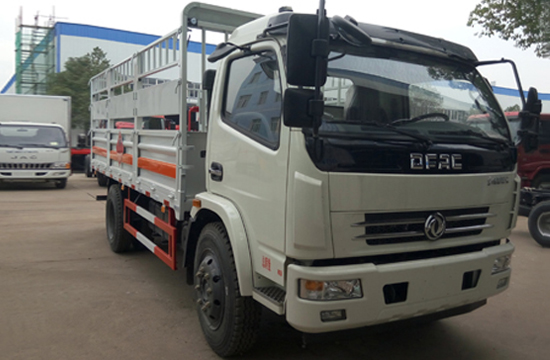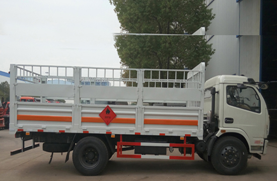 | 整车说明: | 该车适用于运输危险品。用于运输具有独立容器(瓶)包装的易燃气体(类项号:2.1):液化石油气,压缩甲烷或甲烷含量高的压缩天然气,乙炔,乙烷,丁烷,丙烯,丁烯,二甲醚,压缩氧;用于运输具有独立容器(瓶)包装的非易燃无毒气体(类项号:2.2):二氧化碳,压缩氧(氮,空气,氦,氩,氖)。防护材料:Q235A碳钢,连接方式:左右侧面及后部防护均采用焊接连接,后部防护断面尺(mm):100×50, 后部防护离地高度(mm):500。仅采用底盘子午线轮胎和带ABS的底盘,该车前轮安装盘式制动器,前置排气管,装配限速装置,限速80km/h。安装带有卫星定位功能的行驶记录仪。ABS系统生产厂家及型号:襄阳东风隆诚机械有限责任公司,ABS/ASR-24V-4S/4M。随底盘选装前面罩,前保险杠,前组合灯具。上装可选装无栅栏。后部液压尾板收起状态的水平长度是250mm。危险货物运输车辆的车辆类型(FL型车辆)。 | ||